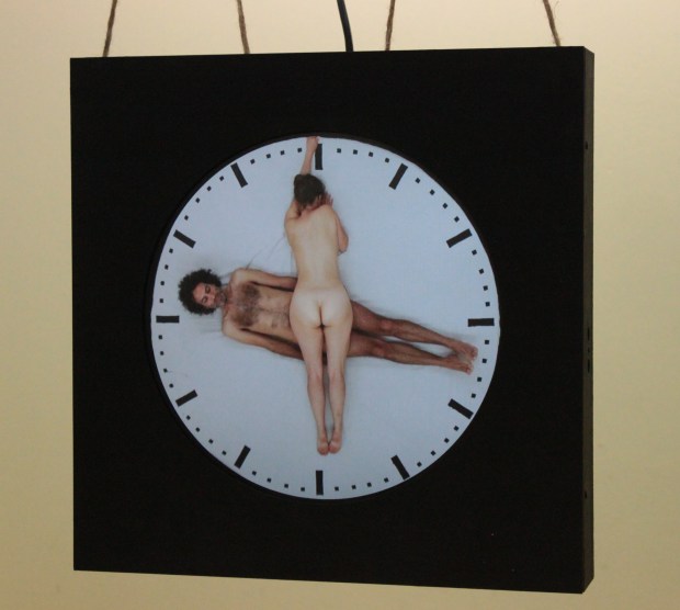 La nuit du 11 décembre 2018, alors que ma compagne était allongée sur moi et effectuait un tour dont l’axe était nos sexes réunis, l’image de L’horloge de l’amour m’est apparue. L’image a persisté, à tel point qu’il me sembla nécessaire de lui donner réalité. Le 20 juin 2019, nous avons réalisé, à huis clos sur un matelas de 2,32m de diamètre, une performance filmée de 12h servant de base à L’horloge de l’amour.